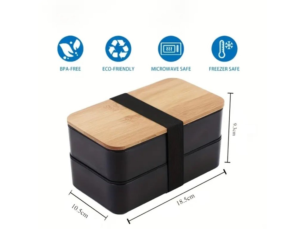 - Zestaw zawiera: 2 piętrzące się boxy, sztućce, separator, gumowy pasek zabezpieczający