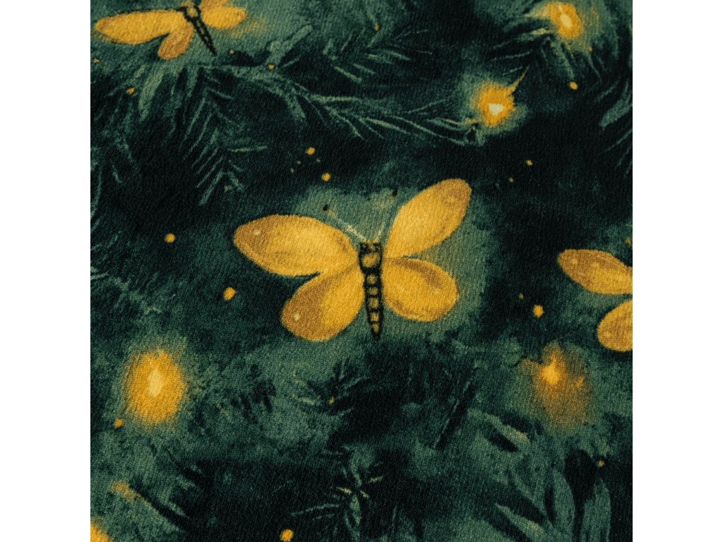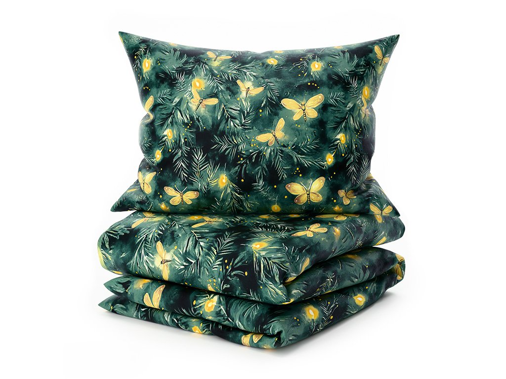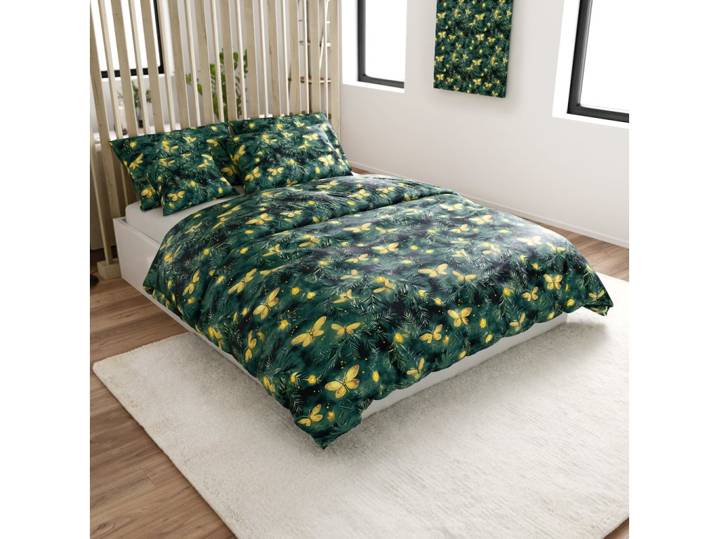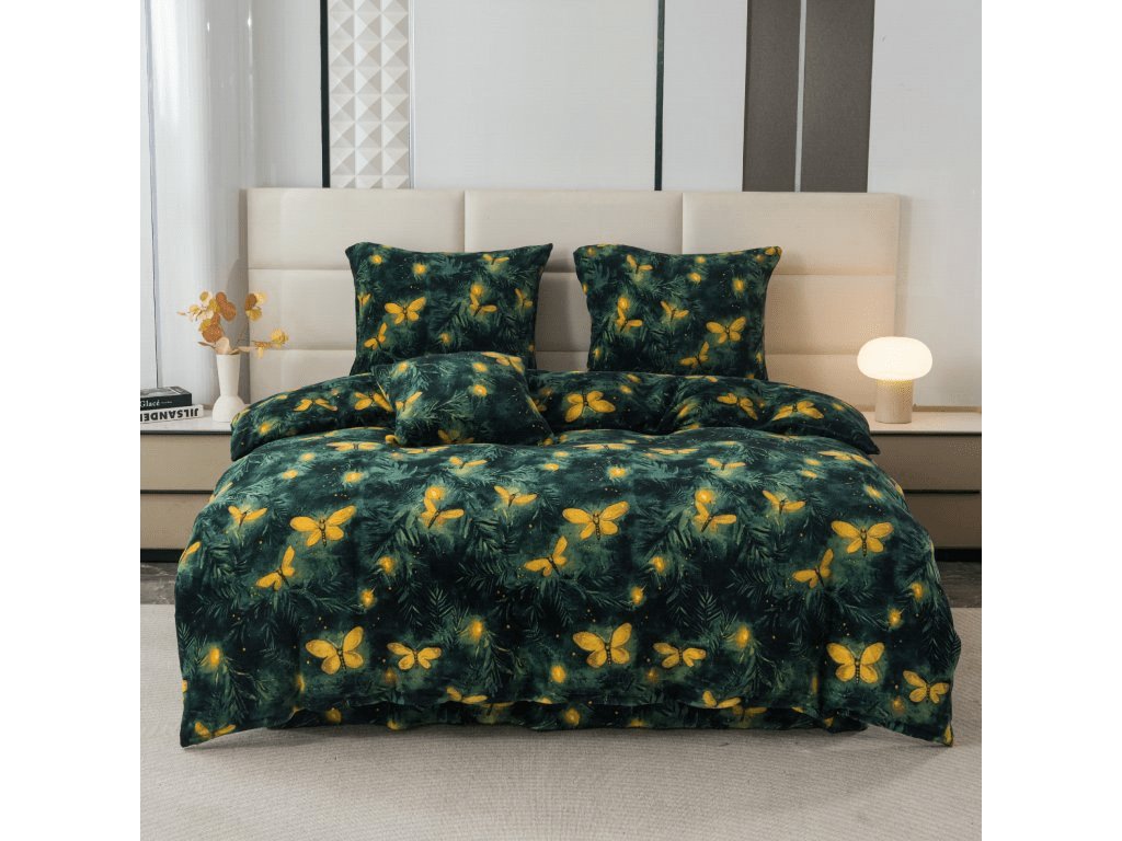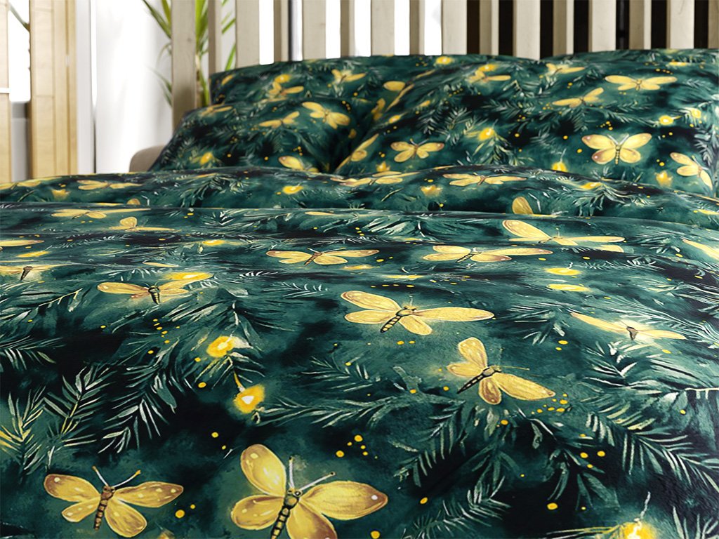 Sada mikroplyšového povlečení YELLOW BUTTERFLY tmavě zelené + prostěradlo mikroplyš SOFT 180x200 cm bílé, dvoulůžko