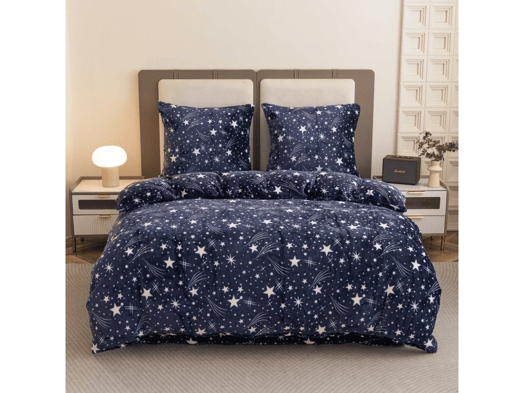 Zestaw pościel z mikropluszu STARLIGHT ciemnoniebieski + prześcieradło z mikropluszu SOFT 90x200 cm białe, łóżko pojedyncze