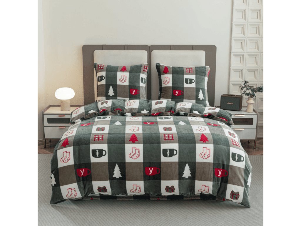 Zestaw pościeli z mikropluszu CHRISTMAS SOCKS w zielonej specyfikacji jest idealny na zimowe wieczory pełne spokoju i relaksu. Urocze świąteczne motywy skarpetek, kubków, prezentów i choinek na kraciastym tle tworzą świąteczną atmosferę na pierwszy rzut oka. Mikropluszowy materiał jest ekstremalnie ciepły, miękki i bardzo przyjemny w dotyku - idealny wybór na chłodne miesiące. W skład zestawu wchodzi również delikatne białe prześcieradło z mikropluszu, które dopełnia wrażenie komfortu.