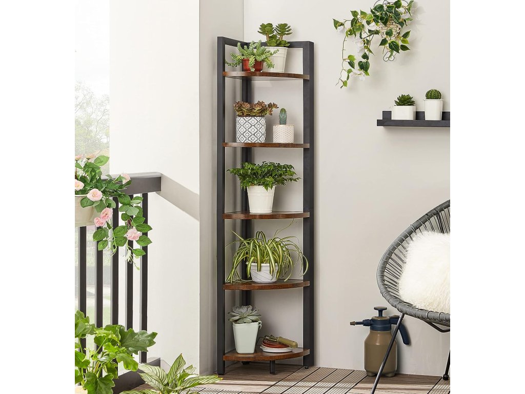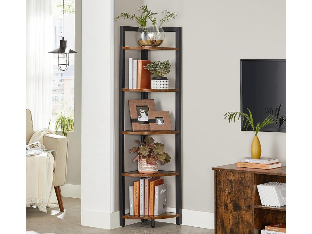 - Praktyczny rogowy regał z zaokrąglonymi półkami w rustykalnym stylu