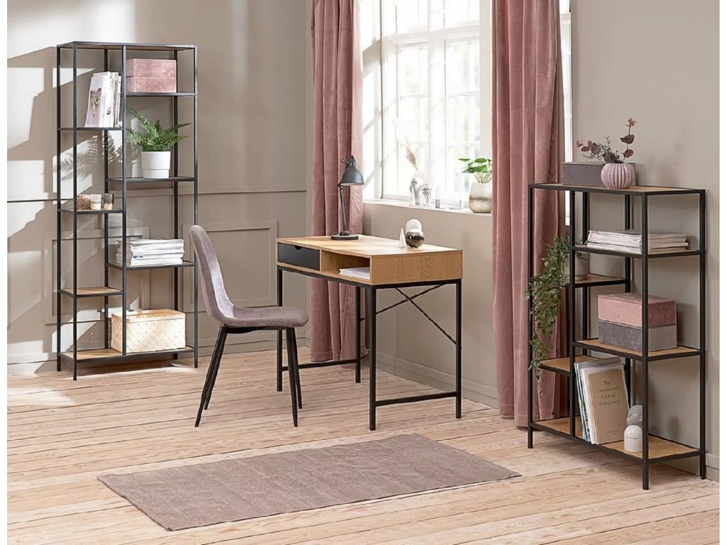Biurko z blatem w dekorze dąb B-027 jest idealnym wyborem dla nowoczesnej przestrzeni roboczej lub do nauki. Łączy elegancki design z praktycznymi elementami – oferuje przestronną powierzchnię roboczą, otwartą przegródkę i szufladę do przechowywania drobiazgów. Czarna metalowa konstrukcja dodaje biurku stabilności i stylowego industrialnego wyglądu.