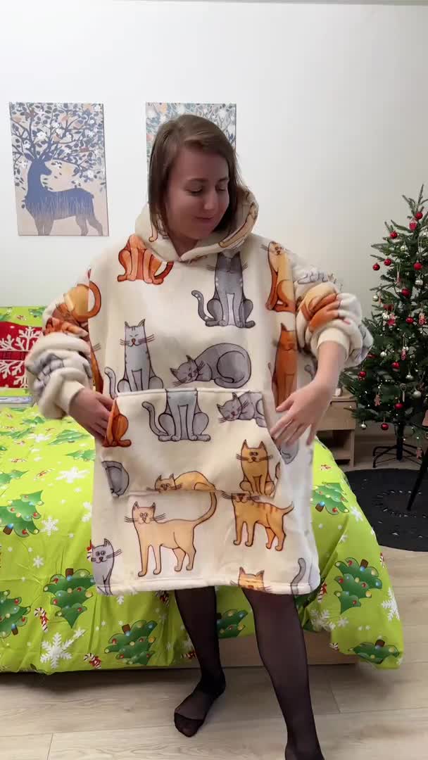 Koc mikinowy z baranka z rękawami i kapturem COLORED CATS kremowy