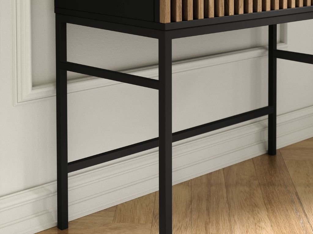 Ten stolik łączy styl i funkcjonalność, czyniąc go idealnym wyborem zarówno do sypialni, jak i przedpokoju. W sypialni posłuży jako elegancka toaletka do przechowywania kosmetyków i biżuterii, natomiast w przedpokoju oferuje praktyczną przestrzeń na klucze, dekoracje czy inne niezbędne przedmioty. Kombinacja lustra, szuflady i otwartych półek zapewnia maksymalną wszechstronność. Jego matowa czarna powierzchnia z dekorem dębu artisan dodaje wnętrzu nowoczesnego, a jednocześnie przytulnego charakteru. Wyróżni się w każdym zakątku domu i łatwo stanie się jego ulubioną częścią.