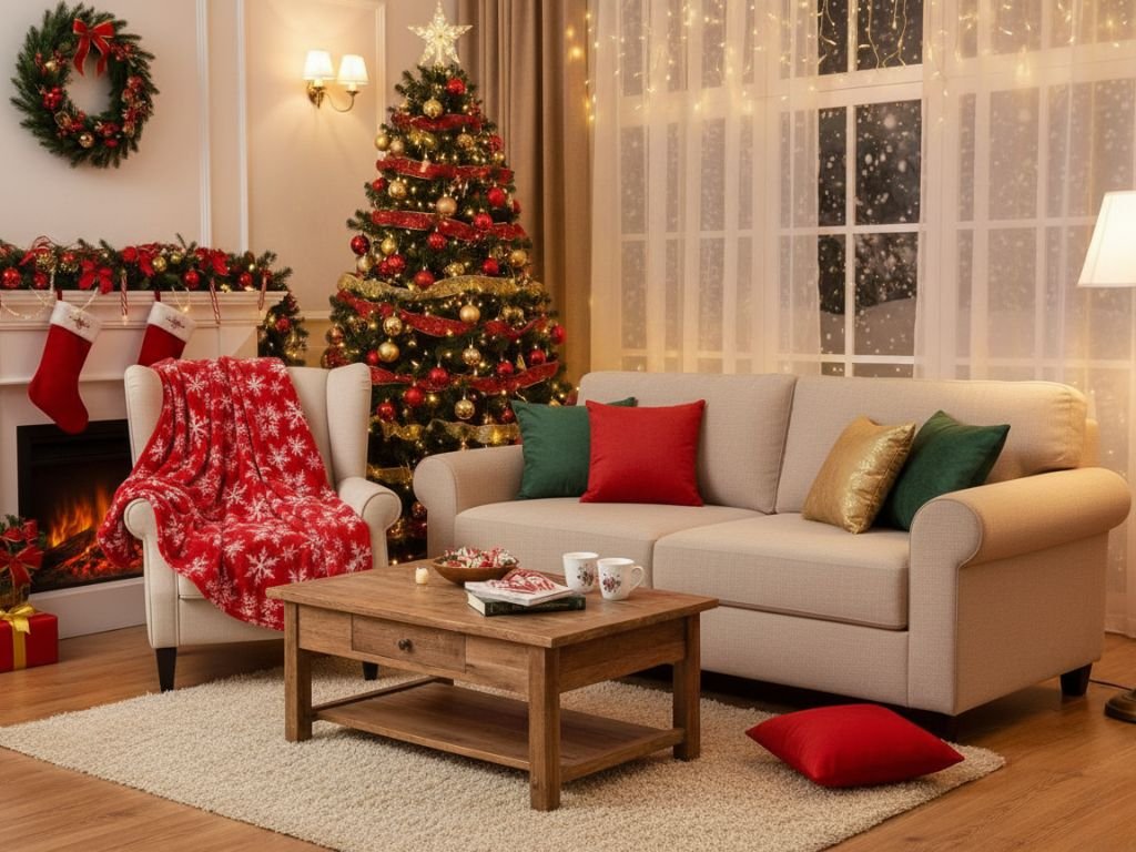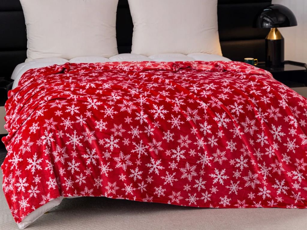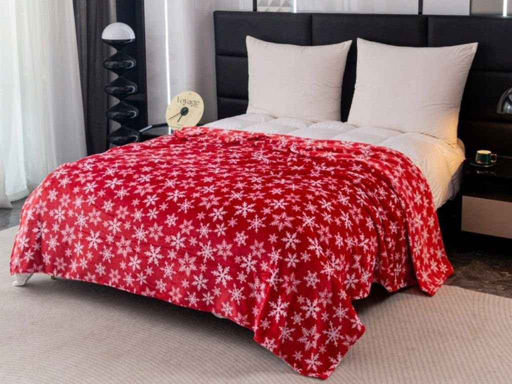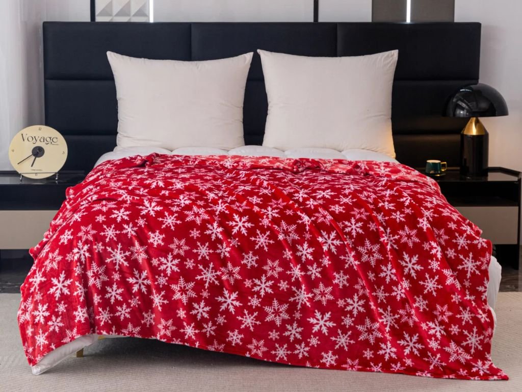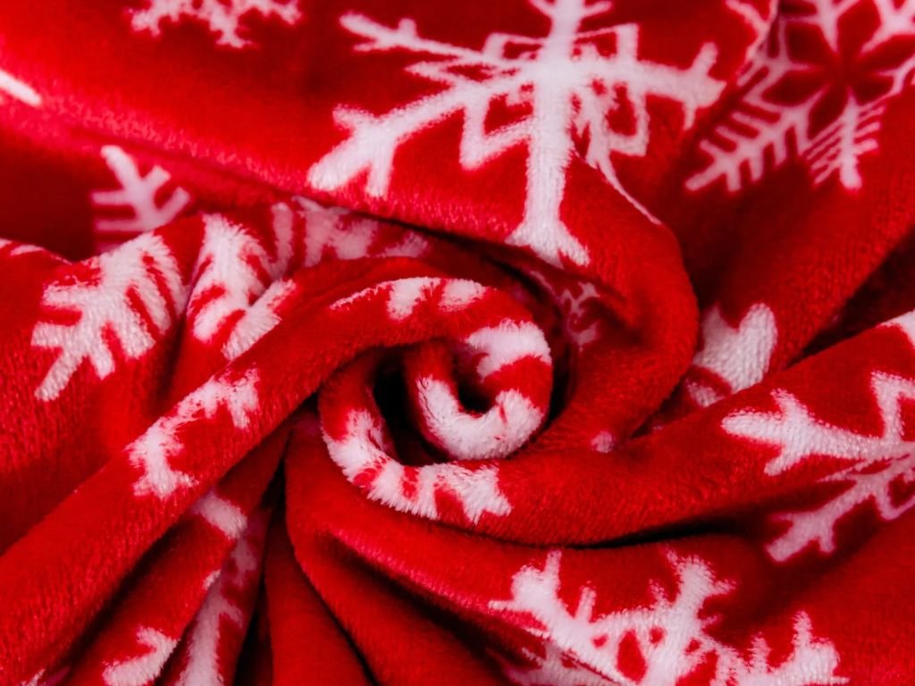 Świąteczny mikropluszowy koc FROSTY FLAKES, czerwony