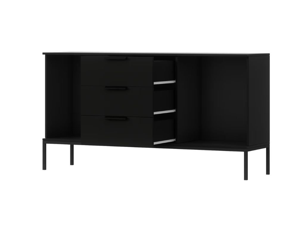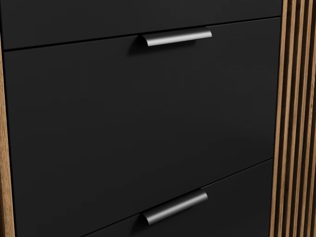 Wnieś do swojego domu styl i funkcjonalność dzięki przemyślanemu rozwiązaniu przechowywania, które łączy estetykę z praktycznością. Komoda doskonale sprawdzi się jako elegancki dodatek do salonu, pracowni lub przedpokoju, a jej połączenie szafek, szuflady i otwartego miejsca pozwala na dowolne zaaranżowanie dekoracji, książek czy codziennych potrzeb. Dzięki czystemu designowi w czarnym wykonaniu wyróżnią się również minimalistyczne dodatki, świece lub rośliny, które nadadzą wnętrzu wyjątkowy charakter. Wykorzystaj każde miejsce na pełnię i stwórz otoczenie, które odzwierciedli twój styl i potrzeby.