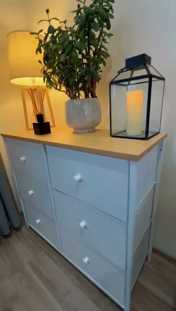 Ta stylowa komoda w połączeniu białej tkaniny i naturalnego dekoru dębu jest idealnym rozwiązaniem do codziennej organizacji. Niezależnie od tego, czy postawisz ją w sypialni na bieliznę, w przedpokoju na akcesoria, czy w pokoju dziecięcym na zabawki, zawsze zaoferuje dostatek miejsca dzięki 6 pojemnym szufladom. Dzięki swojej lekkiej konstrukcji łatwo ją przemieszczać, a mimo to pozostaje stabilna dzięki wzmocnieniom i możliwości przymocowania do ściany. Elegancki wygląd i praktyczne zastosowanie czynią ją idealnym wyborem do każdego domu.