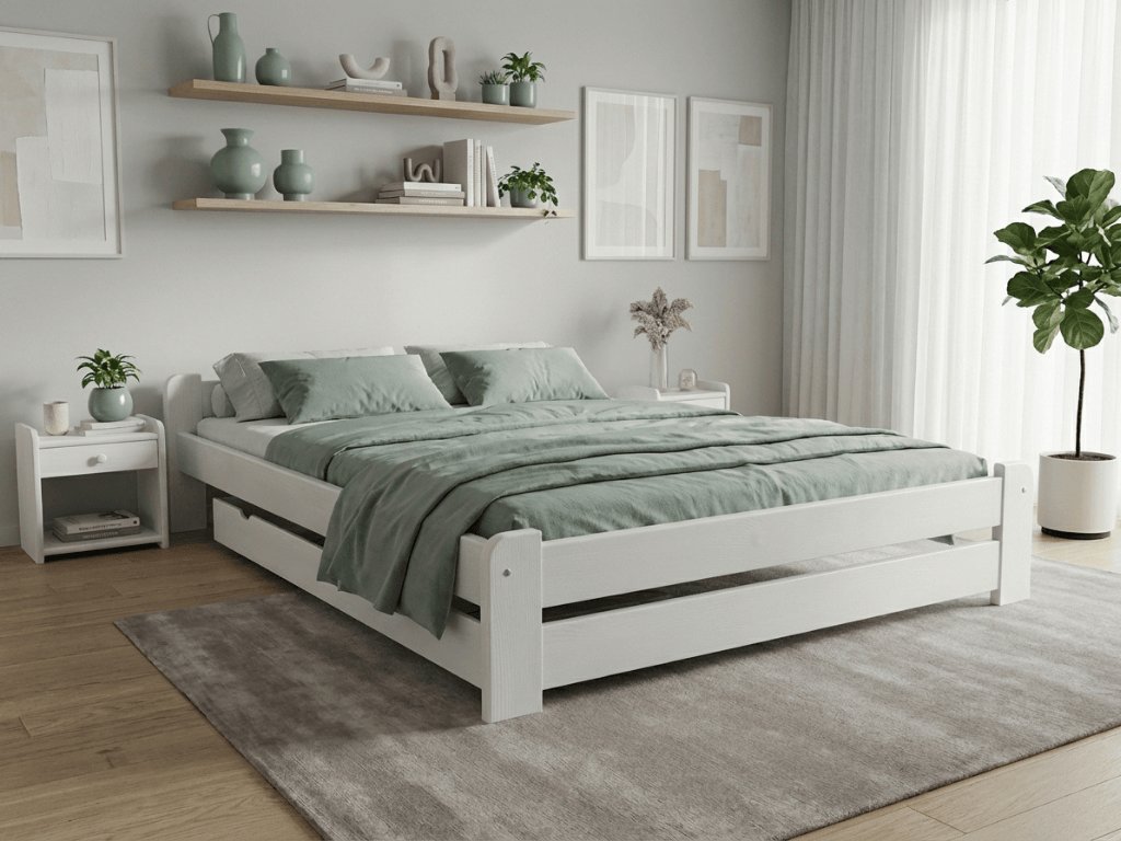 Nowoczesne wnętrze i czyste linie pomoże Ci wytworzyć białe łóżko. Ten neutralny kolor cieszy się popularnością od wielu lat i powraca na zasłużone pierwsze miejsce popularności. Wygląda świeżo i lekko, z łatwością dopasujesz go do innych odcieni i tonów oraz do ciemniejszych barw. Sypialnia będzie zachęcać do relaksu i spokoju.
