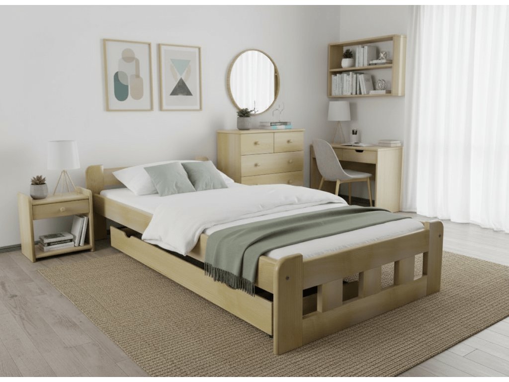 Łóżko w sosnowym dekorze rozświetli Twoją sypialnię i całe jej wnętrze. Drewno w kolorze sosny oferuje piękny wygląd z charakterystycznym rysunkiem słojów w kolorach od kremowego do czerwonawego. Lita sosna oferuje prosty wygląd, który pasuje do wszystkich sypialni, domków i pensjonatów. Małe sęki wyglądają naturalnie i nadają łóżku prawdziwego charakteru natury.