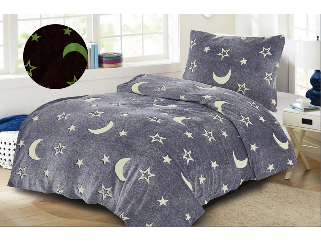 Świecąca pościel z mikropluszu BIG MOON szara + prześcieradło z mikropluszu SOFT 90x200 cm miętowe