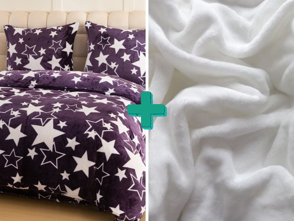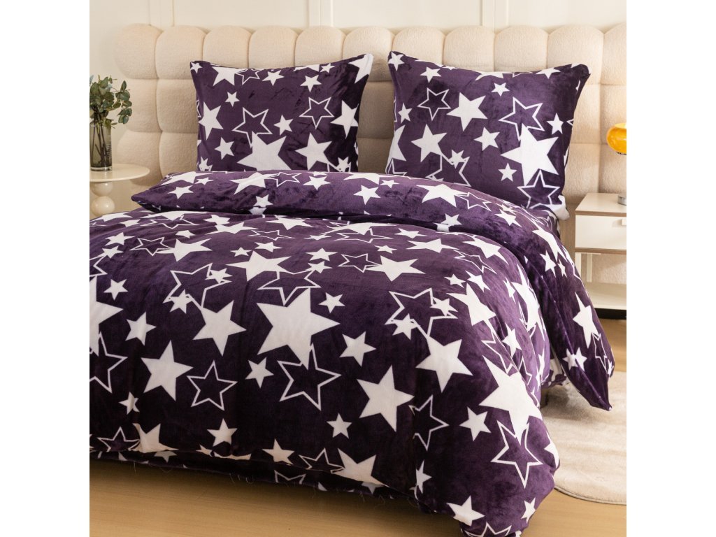 Zestaw pościeli mikropolar HVIEZDY fioletowy + prześcieradło mikropolar SOFT 90x200 cm białe