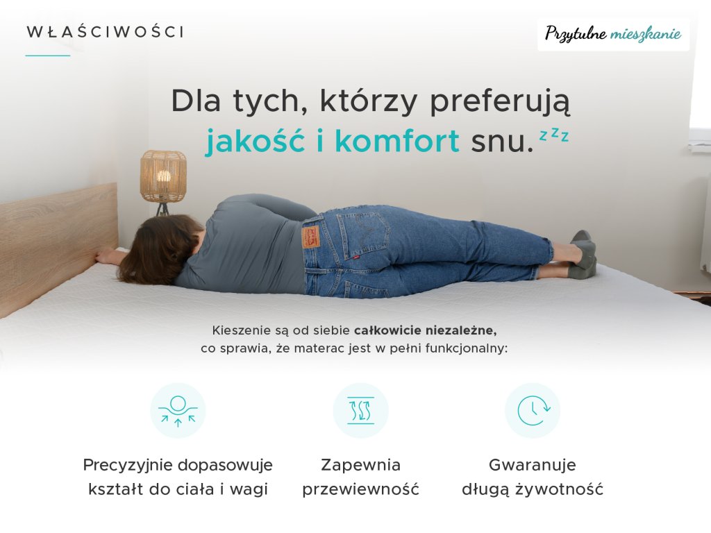 - Dłuższa żywotność w porównaniu z materacami piankowymi dzięki technologii sprężyn w kieszeniach