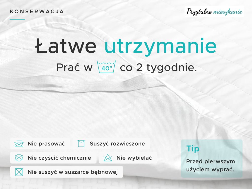 Ochraniacze na materace są naprawdę łatwe w utrzymaniu. Przed pierwszym użyciem upierz ochraniacz i dokładnie go wysusz. Aby zachować wymagane właściwości, a przede wszystkim nieprzepuszczalność, zalecamy pranie w maksymalnej temperaturze 60 °C. Przy regularnej zmianie pościeli wypierz również ochraniacz, najlepiej raz na 14 dni. Po wyschnięciu pozostaw ochraniacz do swobodnego wyschnięcia, nie zalecamy używania suszarki bębnowej. W żadnym wypadku nie należy go wygotowywać, wybielać ani stosować innych chemikaliów. Wierzchnia warstwa z mikrofibry nie wymaga prasowania. Po upraniu i wysuszeniu jest ponownie idealnie czysty i gotowy do użycia.
