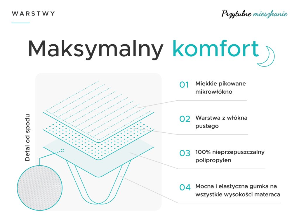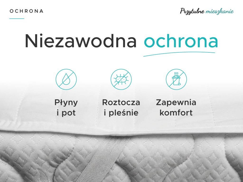 Ochrona materaca to rzecz ważniejsza niż myślisz. Każdy człowiek, czy to dziecko, czy dorosły, poci się z natury. W nocy wypacamy do litra potu, który wnika w prześcieradło i rdzeń materaca. Ochraniacz na materac zwiększy ogólną higienę łóżka. Dodatkowo chroni przed uszkodzeniami mechanicznymi, zabrudzeniami, roztoczami, potem i moczem. Jest to świetny pomocnik do łóżeczek dziecięcych lub pierwszych łóżek. Swe miejsce znajdzie także u dorosłych jako ogólne zabezpieczenie materaca, dla seniorów lub przewlekle chorych, którzy muszą leżeć w łóżku. Wodoodporny ochraniacz tworzy ochronną i nieprzepuszczającą płynów warstwę. Nie musisz się martwić o spanie na ochraniaczu, górna jego warstwa wykonana jest z delikatnej dla skóry i miłej w dotyku mikrofibry.