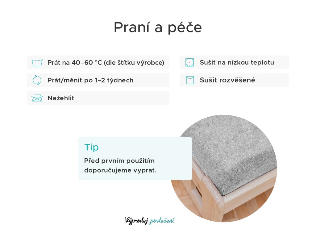 Prześcieradło frotte pierz co drugi lub trzeci tydzień, co pomaga zachować jego miękkość i higienę. Ważne jest, aby używać delikatnego żelu do prania bez płynu do płukania i prać w 40 °C. Płyn do płukania narusza strukturę włókien i prześcieradło twardnieje. Po praniu jak najszybciej powieś na powietrzu lub użyj suszarki na niską temperaturę.