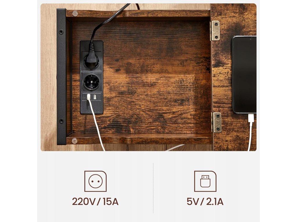 Ten wielofunkcyjny stolik jest idealnym rozwiązaniem dla tych, którzy chcą mieć wygodę i nowoczesne technologie zawsze pod ręką. Dzięki zintegrowanym gniazdom i portom USB łatwo naładujesz telefon, tablet lub lampkę bez zbędnych kabli. Jego kompaktowe wymiary pozwalają na użycie nie tylko obok łóżka, ale także przy sofie lub w kąciku do pracy. Praktyczna kieszeń i przestrzeń do przechowywania utrzymają porządek, a stylowy industrialny wygląd nada wnętrzu osobisty charakter. Doskonałe połączenie designu i funkcjonalności.