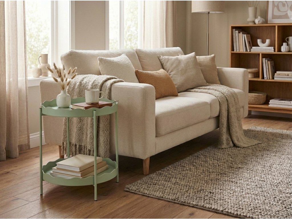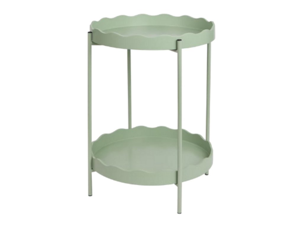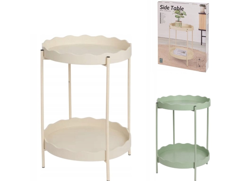 Stolik pomocniczy RAVELO przyciąga uwagę swoim prostym metalowym wykonaniem i wyraźnym falistym obrzeżem na obu powierzchniach. Dzięki średnicy 40,5 cm i dwupoziomowej konstrukcji oferuje wystarczająco miejsca na odstawienie różnych przedmiotów, nie zajmując przy tym wiele przestrzeni. Doskonale pasuje do kanapy, sypialni oraz przedpokoju. Jego delikatna barwa i czysty design umożliwiają łatwe łączenie z naturalnymi materiałami, pastelowymi tonami oraz skandynawskim lub nowoczesnym stylem.
