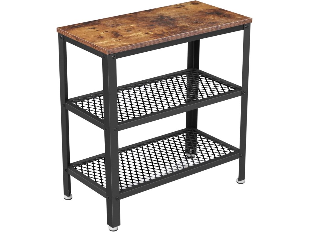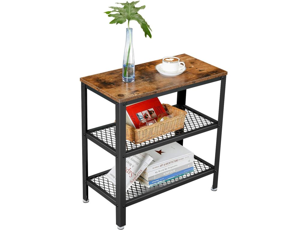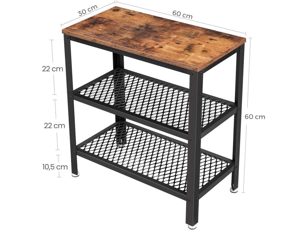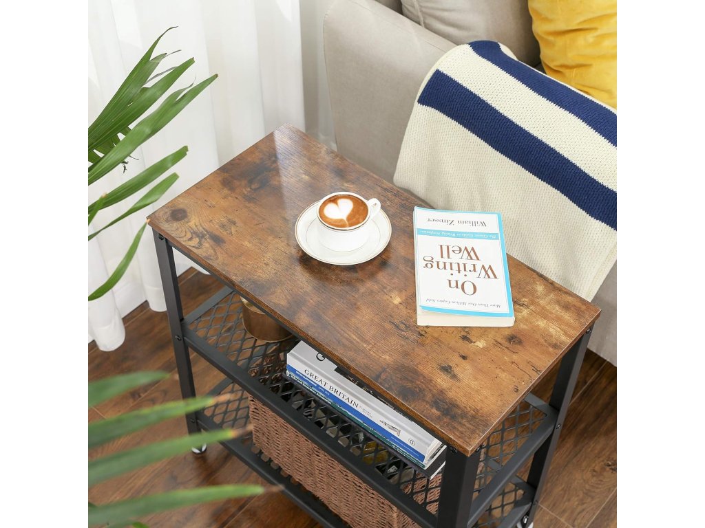 Dzięki swojemu kompaktowemu kształtowi i praktycznemu wykonaniu, ten stolik stanie się nieodzownym towarzyszem w każdym pomieszczeniu. Oferuje idealną przestrzeń na odłożenie książki, filiżanki kawy lub dekoracji, podczas gdy dolne metalowe półki służą do przejrzystego przechowywania czasopism, koszyków czy elektroniki. Połączenie drewna i metalu nadaje wnętrzu industrialny charakter, a jednocześnie łatwo się komponuje z różnymi stylami wyposażenia. Użyj stolika obok sofy, w przedpokoju lub jako stolik nocny – możliwości są liczne.