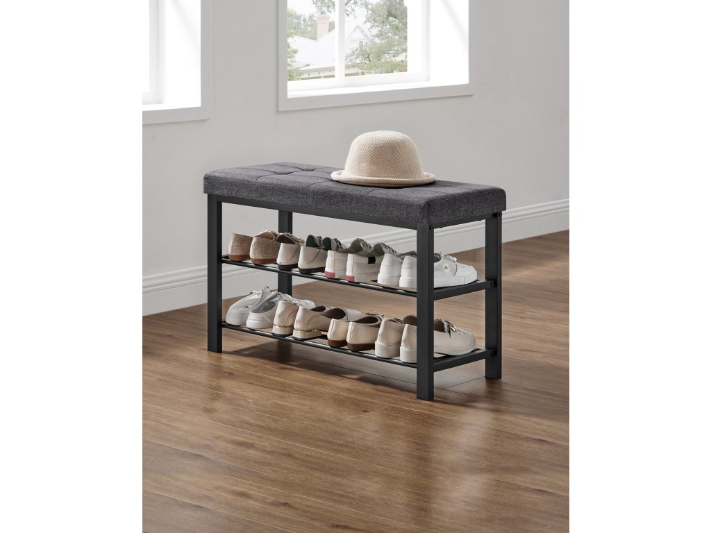 Elegancka ławka, która łączy wygodę i praktyczność – ten model do przedpokoju oferuje nie tylko miękko tapicerowane siedzisko w szarym kolorze, ale również dwie metalowe półki kratowane do przejrzystego przechowywania obuwia. Solidna metalowa konstrukcja w czarnym wykonaniu zapewnia stabilność oraz długą żywotność, jednocześnie prosty i nowoczesny design łatwo wpasuje się w różne wnętrza. Idealne rozwiązanie dla każdego, kto szuka funkcjonalnego i stylowego mebla, który uprzyjemni codzienne zakładanie butów i utrzyma porządek w przedpokoju.